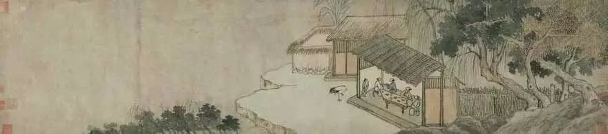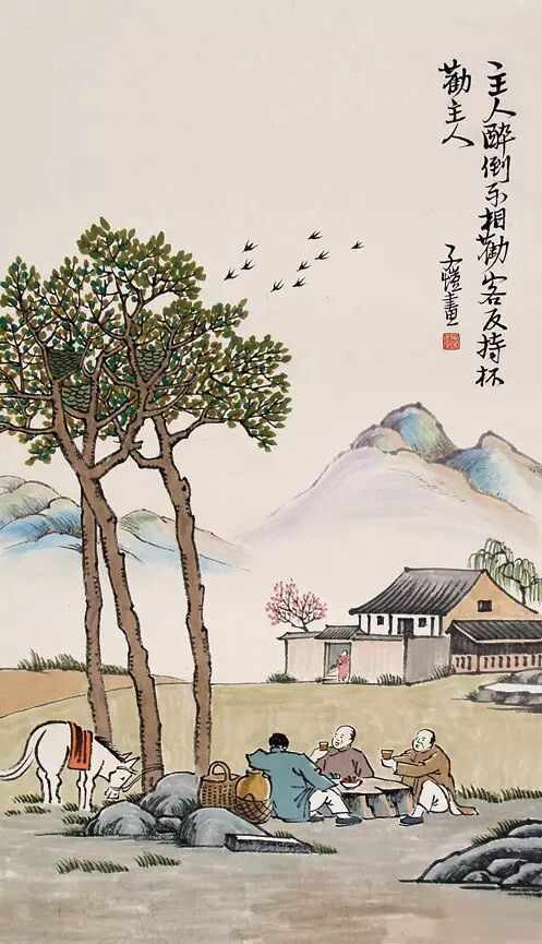 (上图)蓝、淡紫、绿、土黄,拼接出远处的山。相比于这幅画,上幅画的用笔更直接,笔锋明显。而这一幅图更有晕染效果,使远景拉得更开,更能突出山间饮酒之无拘,远离烦嚣之意境。