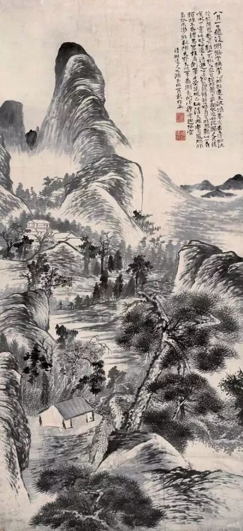 (上图)石涛的山水立轴不胜数,篇幅有限,就看这一幅。丰子恺用颜色铺设出山的层次,而石涛的整幅画纯粹靠线条。