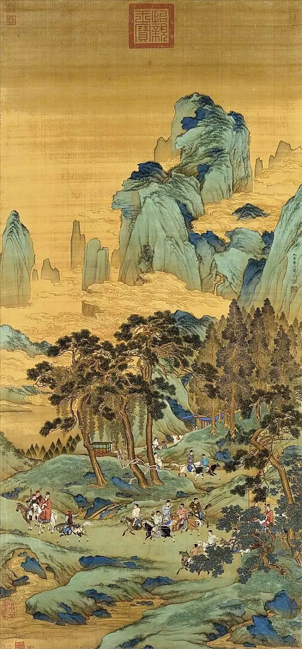(上图)仇英的构图和设色简直无敌。红印居中,挂于顶峰,气势意境都令人叫绝。