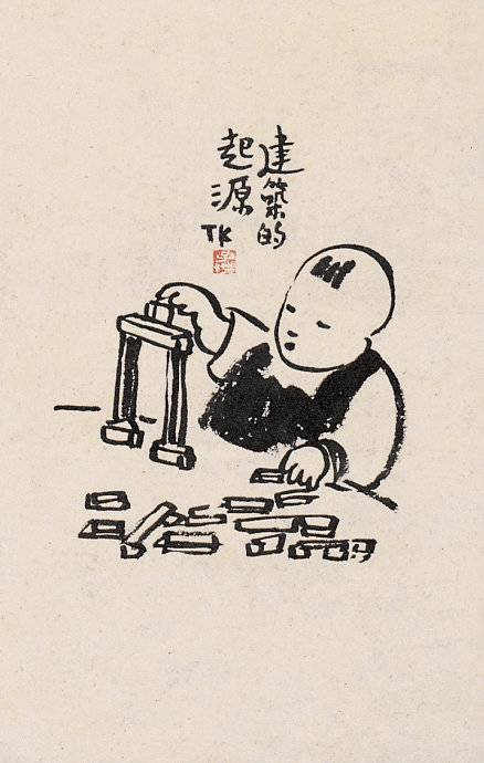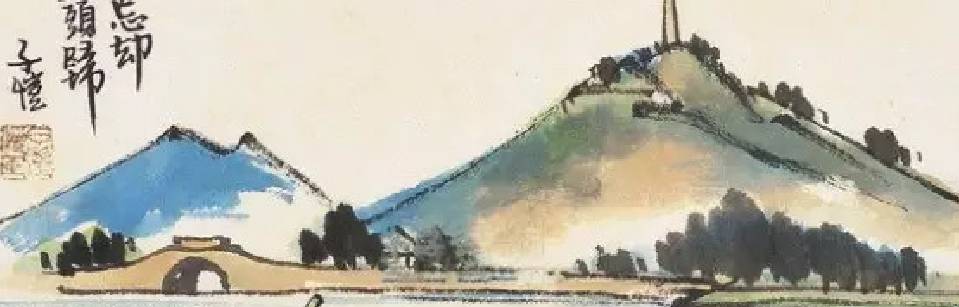 丰子恺的近景通常是简单的单色填充,可是远景的山却采用了丰富的变换,运用了中国古典山水画的技巧。
